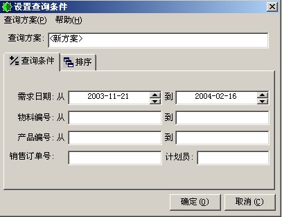 查詢方式有三種:定位、自定義查詢、查詢。查詢的查詢條件中列有:需求日期范圍、物料編號范圍、產(chǎn)品編號范圍、銷售訂單號、計劃員。系統(tǒng)默認(rèn)的查詢條件是當(dāng)前日期之前的所有產(chǎn)品編號范圍的所有計劃情況。您能對接口上的條件進(jìn)行任意組合。對于自定義的查詢條件具體設(shè)定請參見《公共操作手冊》。查詢接口如圖。